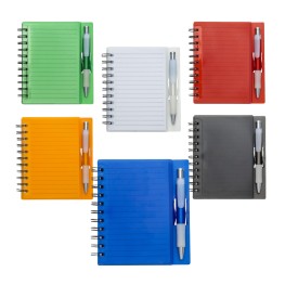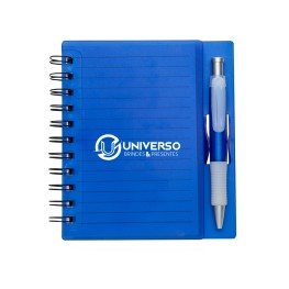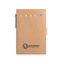 Bloco de anotações A7 com 70 folhas lisas de papel reciclado, capa dura em cartão e elástico. Incluso lápis com borracha na ponta.