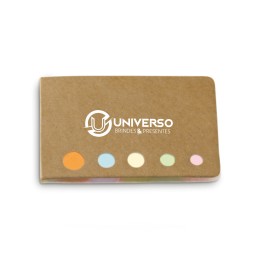 Bloco de anotações ecológico com capa de bambu e faixa preta, contendo 70 folhas pautadas com logo reciclado. Inclui suporte elástico de nylon e caneta de papelão com detalhes plásticos.