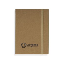 Bloco de anotações emborrachado com porta caneta em nylon, marcador de página em cetim e fita elástica para lacre. Contém aproximadamente 80 folhas pardas sem pauta.