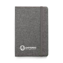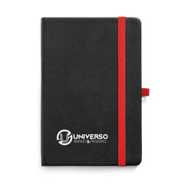 Caderno de couro sintético, marcador de página em cetim e fita elástica para fechar. Contém aproximadamente 78 folhas amareladas sem pauta.
