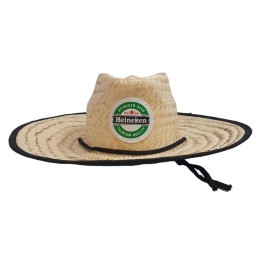 Chapéu de palha com aba levemente ondulada e faixa de poliéster fixa, feito em tamanho único com ajuste interno.