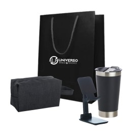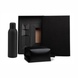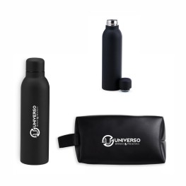 Kit garrafa e nécessaire composto por garrafa dupla camada em Inox na cor preta, confeccionada com detalhes em bambu na tampa e na base. Conta também com nécessaire com alça em material sintético na cor preta.