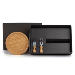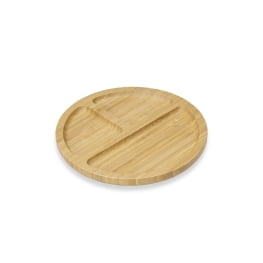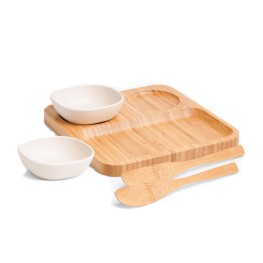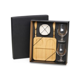 Kit petisco composto por petisqueira em bambu com dois espaços e dois copos americanos multiuso em vidro.