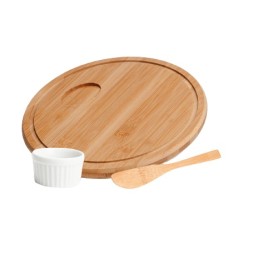 Kit petisco composto por petisqueira em bambu com dois espaços e dois copos americanos multiuso em vidro.