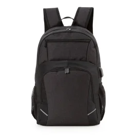 Mochila de 26 litros em couro sintético resistente à água, com dois bolsos frontais, um compartimento intermediário e bolso lateral em rede para garrafas. O interior acomoda notebooks de até 15,6″ e inclui extensor USB para recargas práticas. Ideal para proteger e transportar tudo com comodidade no dia a dia.