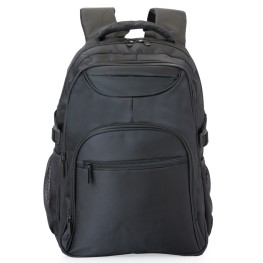 Mochila para notebook em 600D de alta densidade. Compartimento forrado, com duas divisórias almofadadas para notebook até 14” e tablet 9.7”. Com um bolso frontal e lateral, parte posterior e alças almofadadas.