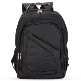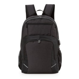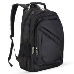 Mochila poliéster para notebook, contém detalhes em nylon e neoprene, compartimento grande com bolso interno, compartimento médio com bolso/suporte para documentos e divisórias para 3 canetas, mini bolso com frontal superior, compartimento pequeno com bolso frontal e dois bolsos laterais de tela.