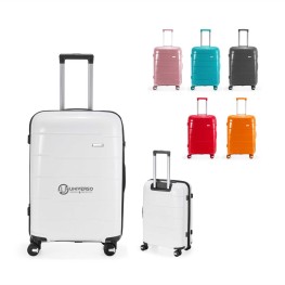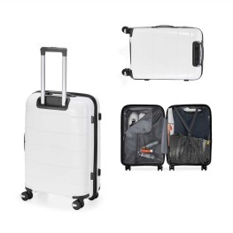 Mala de viagem executivo em ABS com interior forrado, com divisória. Fecho de segurança com senha na lateral, 4 rodas giratórias, pega extensível em alumínio e com mola (altura da pega estendida até 435 mm). Mala com capacidade até 36 L e peso de 2,80 kg.